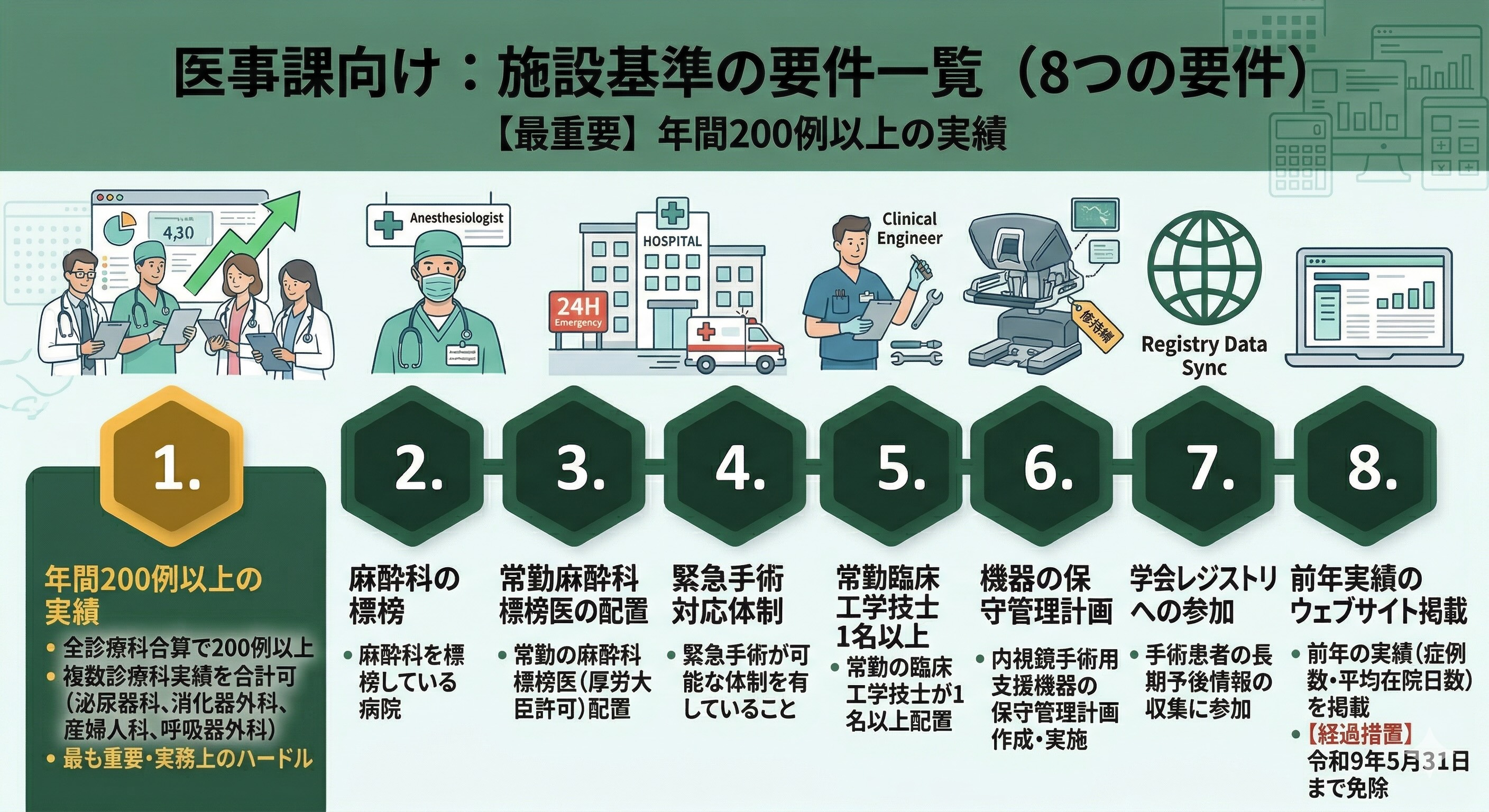 (2)〜(6)の体制要件(麻酔科標榜、臨床工学技士配置、保守管理計画等)は比較的クリアしやすい要件ですが、(7)のレジストリ参加の状況は各診療科・学会の担当者に確認が必要です。
